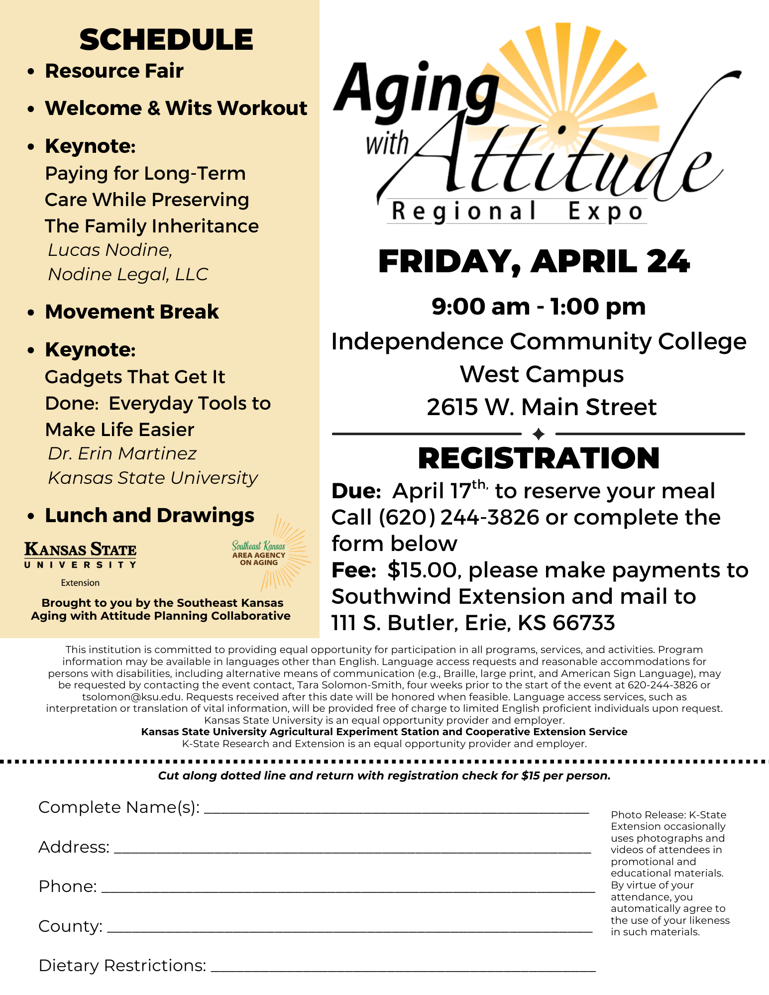 Aging With Attitude-Friday, April 24, 9:00 A.M.-1:00 P.M. Independence Community College West Campus, 2615 W. Main St. Registration Due April 17th to reserve your meal. Call 620-244-3826 or complete the form on the flyer. Fee: $15.00, please make payments to Southwind Extension and mail to 111 S. Butler, Erie, KS 66733