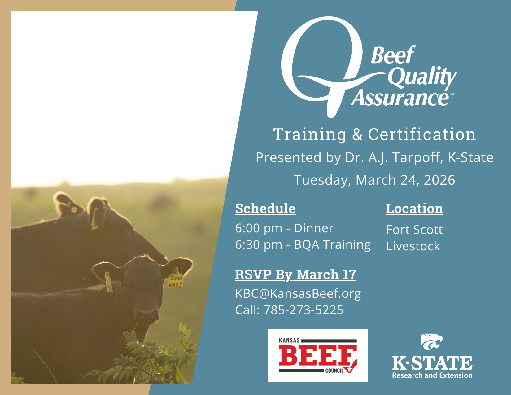 Beef Quality Assurance-Training & Certification-Presented by Dr. A.J. Tarpoff. Tuesday, March 24, 2026, Dinner 6:00 P.M., 6:30 P.M. BQA Training. Fort Scott Livestock. RSVP by March 17th at KBC@KansasBeef.org or 785-273-5225.