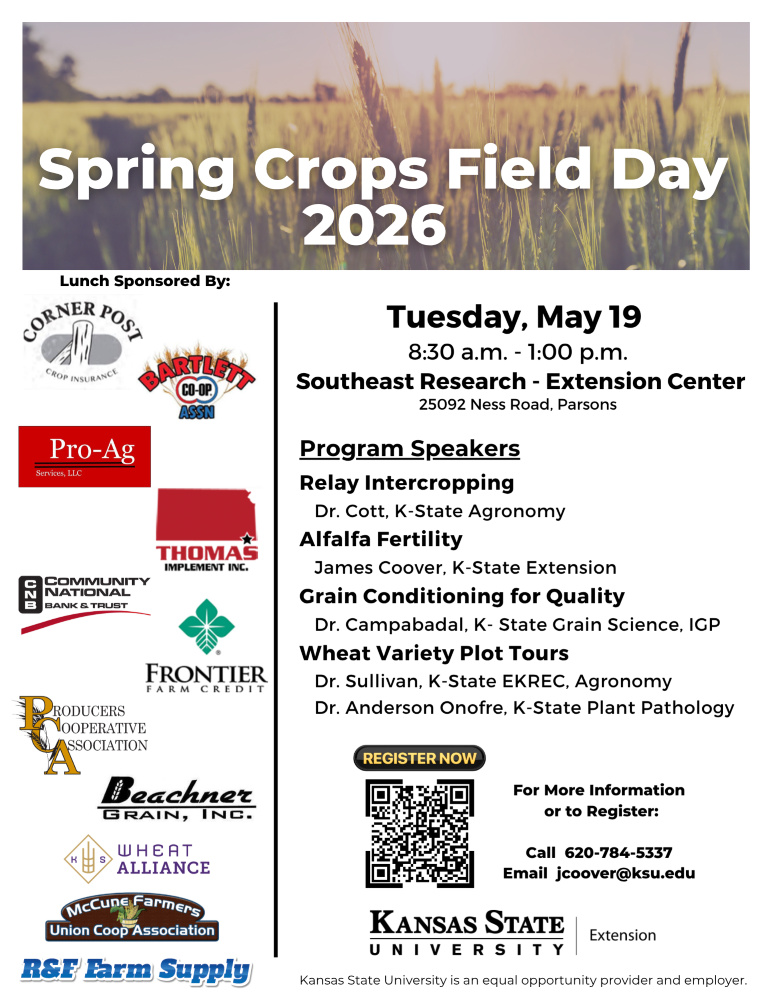 Spring Crops Field Day 2026-Tuesday, May 19, 8:30 A.M.-1:00 P.M. Southeast Research Extension Center, 25092 Ness Rd. Parsons, KS. To register you can scan the QR code on the flyer or call 620-784-5337 or email jcoover@ksu.edu