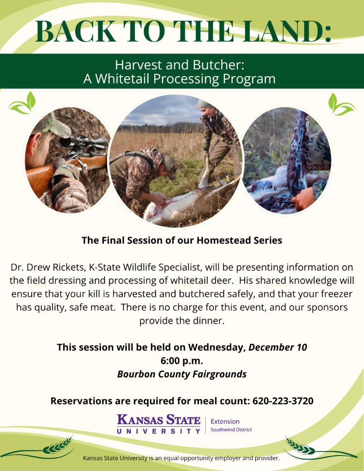 Back To The Land: Harvest and Butcher: A Whitetail Processing Program-Dr. Drew Rickets, K-State Wildlife Specialist, will be presenting information on the field dressing and processing of whitetail deer. Wednesday, December 10th at 6:00 P.M. Bourbon County Fairgrounds. Reservations are required for meal count: 620-223-3720